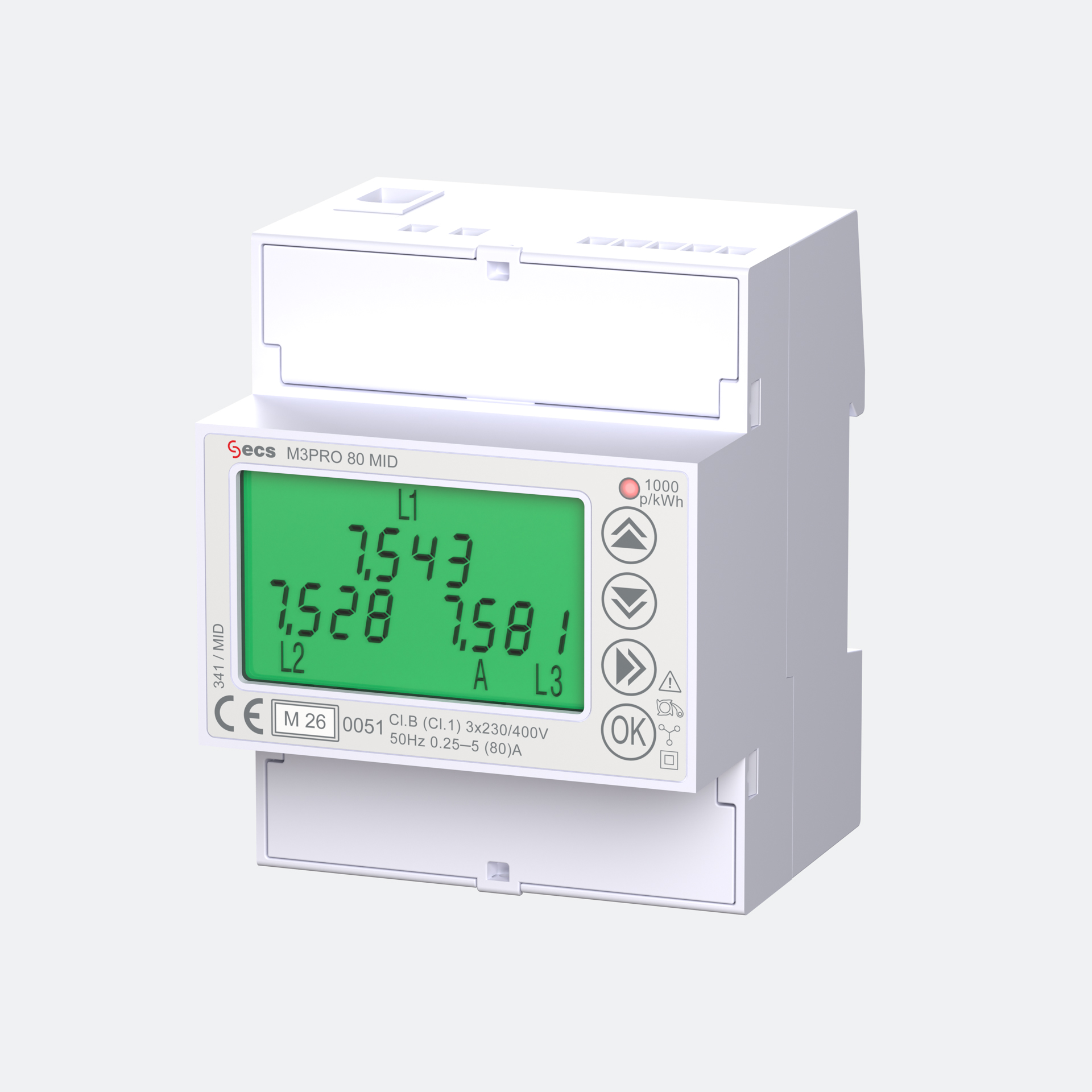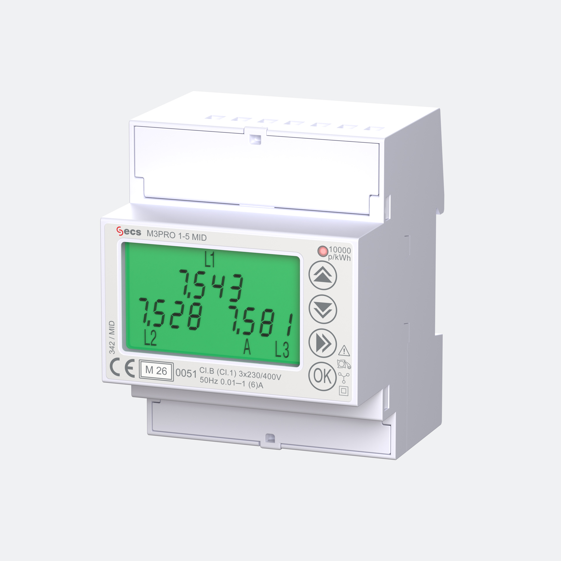 M3PRO 1-5 IP MID: CT-connected three-phase 1-5A meter with Modbus TCP/IP and TLS encryption. MID certified. For EVCS, storage, HVAC and ICS. Made in Italy, OEM ready.
