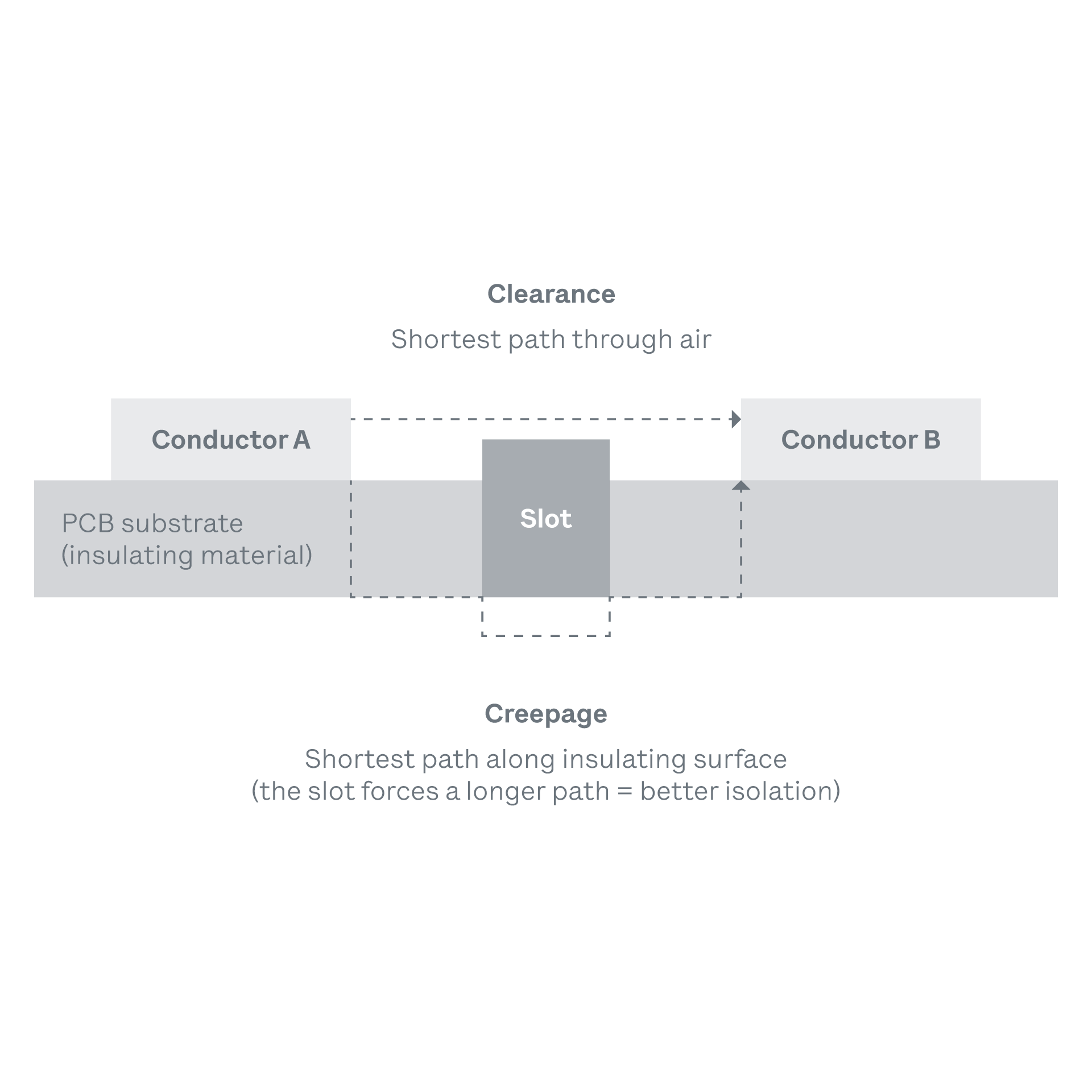 Clearance is the shortest path through air between two conductive parts at different potentials. Creepage is the shortest path along the surface of an insulating material between those same parts. Both are dictated by the nominal voltage, the pollution degree of the operating environment, and the insulation class required.