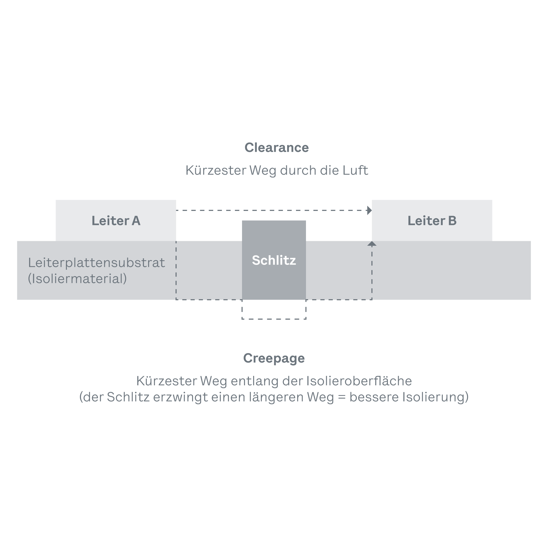 Die Luftstrecke ist der kürzeste Weg durch die Luft zwischen zwei leitfähigen Teilen mit unterschiedlichem Potenzial. Die Kriechstrecke ist der kürzeste Weg entlang der Oberfläche eines Isoliermaterials zwischen denselben Teilen. Beide werden durch die Nennspannung, den Verschmutzungsgrad der Betriebsumgebung und die erforderliche Isolationsklasse bestimmt.