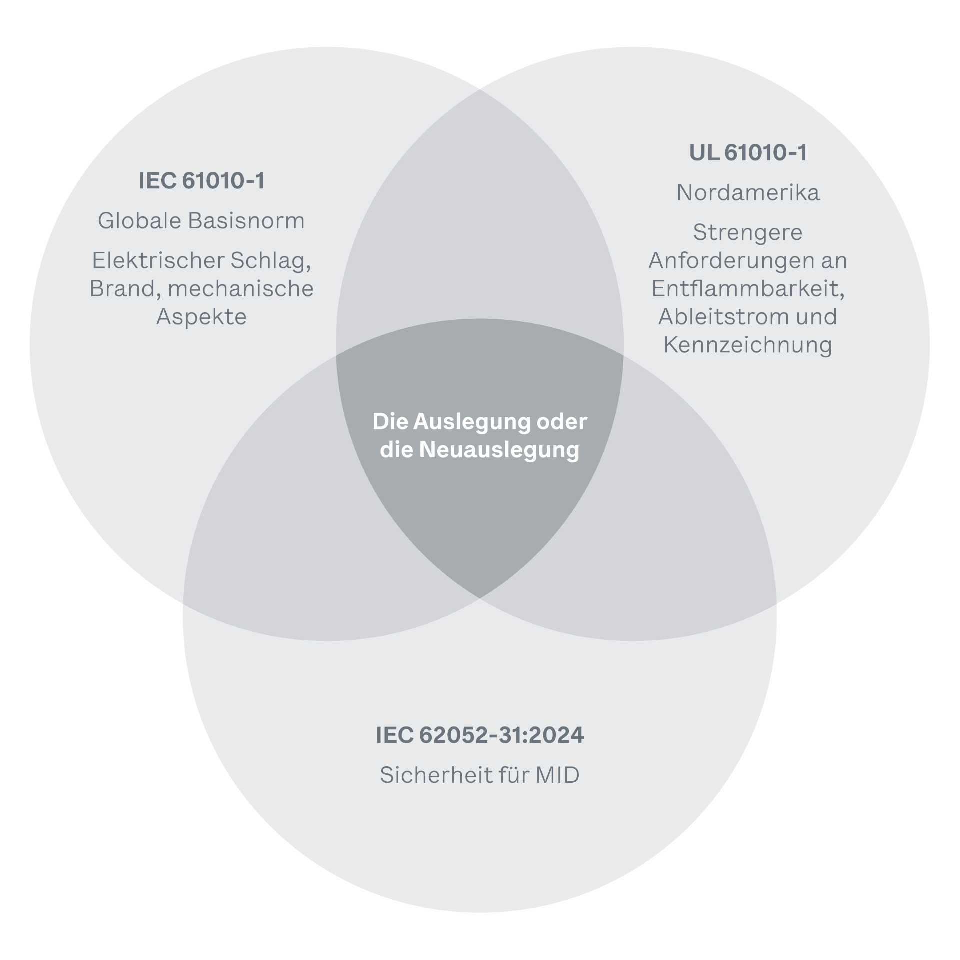 Ein OEM, der einen Zähler in ein Produkt für mehrere Märkte integriert, hat es nicht mit nur einem einzigen Sicherheitsrahmen zu tun. Es laufen mindestens drei normative Regelwerke gleichzeitig nebeneinander, und sie stimmen nicht immer vollständig überein.